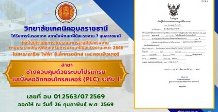 วันที่ 25 พฤศจิกายน 2568 เวลา 10.00 น. นายธาตรี พิบูลมณฑา ผู้อำนวยการวิทยาลัยเทคนิคอุบลราชธานี มอบหมายให้ นายจำรัส ชนะสิงห์ หัวหน้าแผนกวิชาช่างไฟฟ้ากำลัง (เพิ่มเติม…)