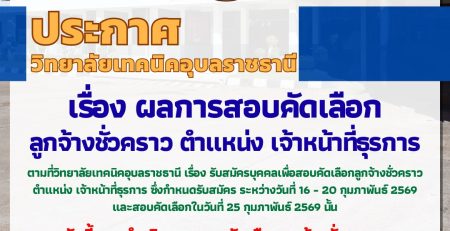 ประกาศวิทยาลัยเทคนิคอุบลราชธานี เรื่อง ผลการสอบคัดเลือกลูกจ้างชั่วคราว ตำแหน่ง เจ้าหน้าที่ธุรการ . ตามที่วิทยาลัยเทคนิคอุบล (เพิ่มเติม…)