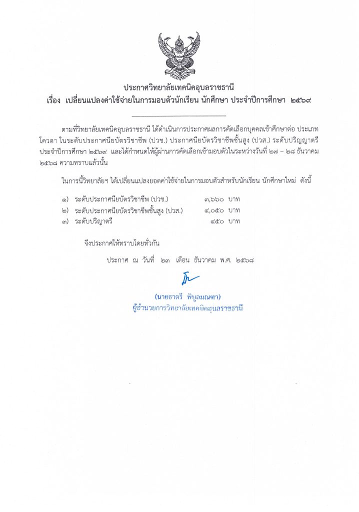 เรื่อง เปลี่ยนแปลงค่าใช้จ่ายในการมอบตัวนักเรียน นักศึกษา ประจำปีการศึกษา 2569