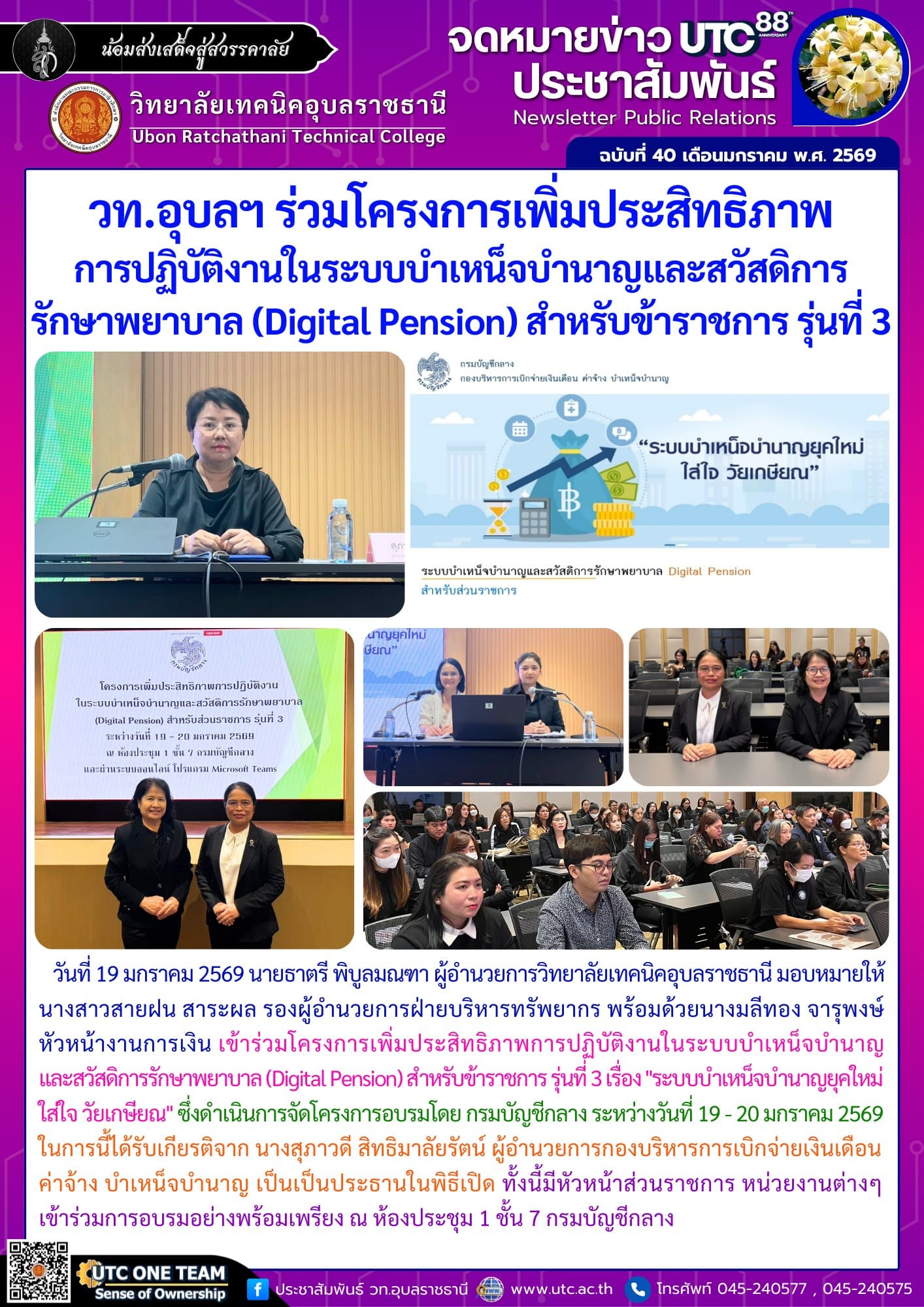 - วท.อุบลฯ ร่วมโครงการเพิ่มประสิทธิภาพการปฏิบัติงานในระบบบำเหน็จบำนาญและสวัสดิการรักษาพยาบาล (Digital Pension) สำหรับข้าราชการ รุ่นที่ 3