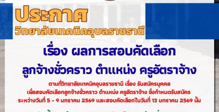 ประกาศวิทยาลัยเทคนิคอุบลราชธานี เรื่อง ผลการสอบคัดเลือกลูกจ้างชั่วคราว ตำแหน่ง ครูอัตราจ้าง